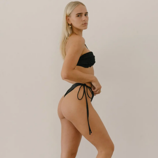 Ziemia Bikini - Black, Smocked Bandeau Top with Optional Halter Tie, by TIALS, Made in Bali, Side Tie Bottoms, Minimal Coverage Bottoms