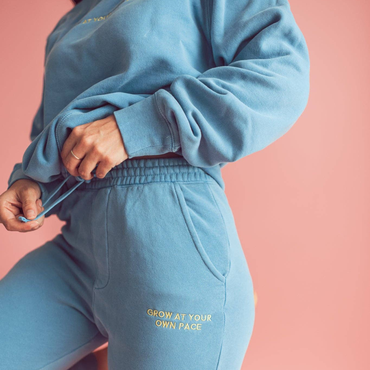 Cozy up in confidence with these light blue Grow At Your Own Pace Sweatpants. Designed for comfort and self-expression, they feature soft yellow embroidery that makes a gentle yet powerful statement. The lightweight, relaxed fit makes them perfect for lounging, running errands, or pairing with your favorite sneakers.